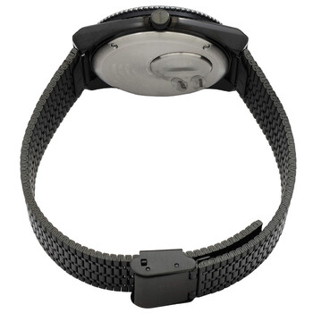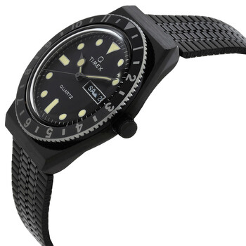 Black stainless steel case and bracelet. Fixed black stainless steel bezel. Black dial with silver-tone hands and index hour markers. Minute markers around the outer rim. Dial Type: Analog. Day of the week and date display at the 3 o'clock position. Quartz movement. Scratch resistant acrylic crystal. Pull / push crown. Solid case back. Round case shape, case size: 38 mm, case thickness: 11.5 mm. Band width: 18 mm. Self-adjust clasp. Water resistant at 50 meters / 165 feet. Functions: date, day, hour, minute, second. Q Timex Reissue Series. Sport watch style. Timex Q Reissue Quartz Black Dial Men's Watch TW2U61600ZV.