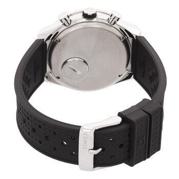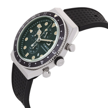 Silver-tone stainless steel case with a black synthetic rubber strap. Bi-directional rotating black stainless steel bezel. Green dial with silver-tone hands and index hour markers. Minute markers around the outer rim. Dial Type: Analog. Date display between 4 and 5 o'clock position. Quartz movement. Scratch resistant mineral crystal. Pull / push crown. Solid case back. Round case shape, case size: 40 mm, case thickness: 11.5 mm. Band width: 18 mm. Buckle clasp. Water resistant at 50 meters / 165 feet. Functions: chronograph, date, hour, minute, second. Q Timex Series. Sport watch style. Timex Q Timex 3-Time Zone Chronograph Quartz Green Dial Men's Watch TW2V70200.
