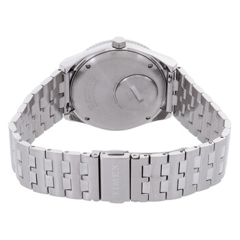 Silver-tone stainless steel case and bracelet. Two-tone (blue and red) stainless steel bezel. Black dial with silver-tone hands and batons hour markers. Minute markers around the outer rim. Dial Type: Analog. Luminescent hands and markers. Date display at the 3 o'clock position. Quartz movement. Scratch resistant acrylic crystal. Solid case back. Round case shape, case size: 38 mm, case thickness: 12.5 mm. Band width: 18 mm. Deployment with push button release clasp. Water resistant at 50 meters / 165 feet. Functions: date, hour, minute, second. Q Timex Series. Sport watch style. Watch label: Swiss Made. Item Variations: TW2V38000VQ. Timex Q Timex Quartz Black Dial Men's Watch TW2V38000.