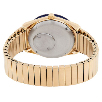 Gold-tone stainless steel case and bracelet. Rotating blue stainless steel bezel. Blue lapis lazuli dial with gold-tone hands and index hour markers. Minute markers around the outer rim. Dial Type: Analog. Quartz movement. Scratch resistant acrylic crystal. Pull / push crown. Solid case back. Round case shape, case size: 36 mm, case thickness: 12 mm. Band width: 16 mm. Expansion clasp. Water resistant at 50 meters / 165 feet. Functions: hour, minute, second. Q Timex Series. Casual watch style. Timex Q Timex Quartz Blue Dial Ladies Watch TW2V92400VQ.