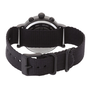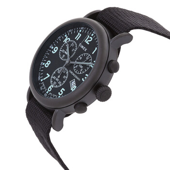 Black low lead brass case with a black fabric strap. Fixed black low lead brass bezel. Black dial with silver-tone hands and Arabic numeral hour markers. Minute markers. Tachymeter markings around the outer rim. Dial Type: Analog. Luminescent indiglo night light. Date display at the 4 o'clock position. Chronograph - three sub-dials displaying: 60 second, 30 minute and 1/10th of a second. Quartz movement. Scratch resistant mineral crystal. Pull / push crown. Solid case back. Round case shape, case size: 41 mm. Band width: 20 mm. Buckle clasp. Water resistant at 30 meters / 100 feet. Functions: chronograph, tachymeter, date, hour, minute, second. Standard Chrono Series. Sport watch style. Timex Standard Chrono Chronograph Quartz Black Dial Watch TW2T21200.