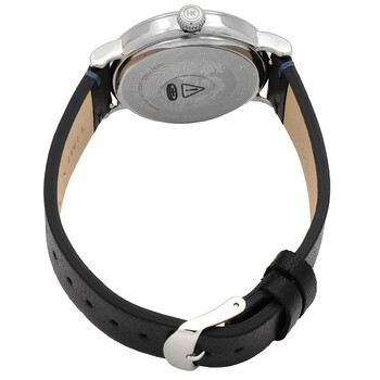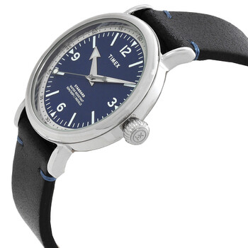 Silver-tone low lead brass case with a black leather strap. Fixed silver-tone low lead brass bezel. Blue dial with silver-tone hands and index-Arabic numeral hour markers. Minute markers around the outer rim. Dial Type: Analog. Quartz movement. Scratch resistant mineral crystal. Pull / push crown. Solid case back. Round case shape, case size: 40 mm, case thickness: 9.5 mm. Buckle clasp. Water resistant at 50 meters / 165 feet. Functions: hour, minute, second. Standard Series. Casual watch style. Timex Standard Quartz Blue Dial Men's Watch TW2V71300.