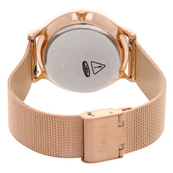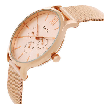 Rose gold-tone brass case with a rose gold-tone stainless steel bracelet. Fixed rose gold-tone brass bezel. Light pink dial with rose gold-tone hands and index-Roman numeral hour markers. Dial Type: Analog. Quartz movement. Scratch resistant mineral crystal. Pull / push crown. Solid case back. Round case shape, case size: 38 mm, case thickness: 6.5 mm. Buckle clasp. Water resistant at 50 meters / 165 feet. Functions: chronograph, hour, minute, second. Transcend Series. Casual watch style. Item Variations: TW2T74500. Timex Transcend Chronograph Quartz Ladies Watch TW2T74500BR.