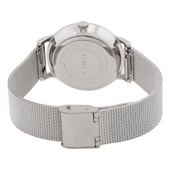 Silver-tone stainless steel case with a silver-tone stainless steel mesh bracelet. Fixed silver-tone stainless steel bezel. Grey dial with silver-tone hands and crystal hour markers. Dial Type: Analog. Quartz movement. Scratch resistant mineral crystal. Pull / push crown. Solid case back. Round case shape, case size: 34 mm, case thickness: 7 mm. Band width: 16 mm. Sliding clasp. Water resistant at 30 meters / 100 feet. Functions: hour, minute. Transcend Series. Dress watch style. Timex Transcend Quartz Crystal Grey Dial Ladies Watch TW2U98200.