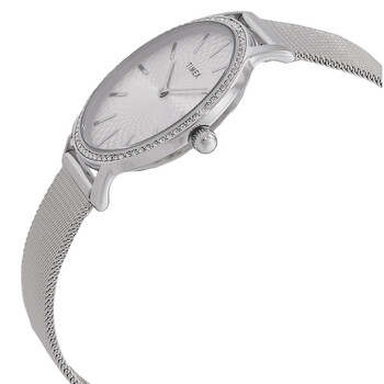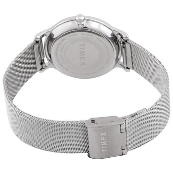 Silver-tone low lead brass case with a silver-tone stainless steel bracelet. Fixed silver-tone bezel with crystal set. Silver-tone dial with silver-tone hands and index hour markers. Dial Type: Analog. Quartz movement. Scratch resistant mineral crystal. Pull / push crown. Solid case back. Round case shape, case size: 34 mm, case thickness: 6.5 mm. Band width: 16 mm. Fold over clasp with a safety release. Water resistant at 30 meters / 100 feet. Functions: hour, minute, second. Transcend Series. Casual watch style. Timex Transcend Quartz Crystal Silver-Tone Dial Ladies Watch TW2V52400.