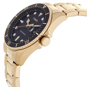 Gold-tone stainless steel case and bracelet. Black stainless steel bezel. Black dial with gold-tone hands and index hour markers. Minute scale around the inner rim. Dial Type: Analog. Luminescent hands and markers. Date display at the 3 o'clock position. Quartz movement. Scratch resistant mineral crystal. Transparent see through case back. Round case shape, case size: 42 mm. Fold over clasp with a safety release. Water resistant at 50 meters / 165 feet. Functions: date, hour, minute, second. Trend Series. Sport watch style. Watch label: Japan Movt. Item Variations: TW2W71700JT. Timex Trend Quartz Black Dial Men's Watch TW2W71700.