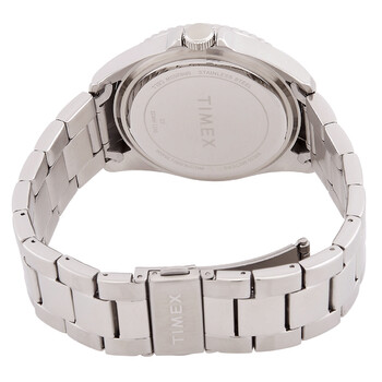 Silver-tone stainless steel case and bracelet. Blue stainless steel bezel. Blue dial with silver-tone hands and index hour markers. Minute scale around the inner rim. Dial Type: Analog. Luminescent hands and markers. Date display at the 3 o'clock position. Quartz movement. Scratch resistant mineral crystal. Transparent see through case back. Round case shape, case size: 42 mm. Fold over clasp with a safety release. Water resistant at 50 meters / 165 feet. Functions: date, hour, minute, second. Trend Series. Sport watch style. Watch label: Japan Movt. Item Variations: TW2W71500JT. Timex Trend Quartz Blue Dial Men's Watch TW2W71500.