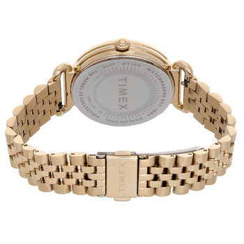 Gold-tone stainless steel case and bracelet. Fixed gold-tone stainless steel bezel. Mother of pearl dial with gold-tone hands and Arabic numeral hour markers. Minute markers around the outer rim. Dial Type: Analog. Quartz movement. Scratch resistant mineral crystal. Pull / push crown. Solid case back. Round case shape, case size: 38 mm, case thickness: 10.5 mm. Band width: 16 mm. Deployment clasp. Water resistant at 50 meters / 165 feet. Functions: hour, minute, second. Trend Series. Casual watch style. Item Variations: TW2T89500. Timex Trend Quartz Ladies Watch TW2T89500VQ.