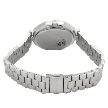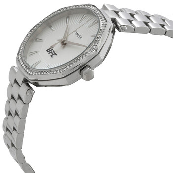 Silver-tone stainless steel case and bracelet. Fixed silver-tone bezel with crystal set. Silver-tone dial with silver-tone hands and index hour markers. Dial Type: Analog. Quartz movement. Scratch resistant mineral crystal. Pull / push crown. Solid case back. Octagonal case shape, case size: 36 mm, case thickness: 8 mm. Band width: 17 mm. Fold over clasp. Water resistant at 50 meters / 165 feet. Functions: hour, minute, second. Ufc Jewel Series. Dress watch style. Timex UFC Jewel Quartz Crystal Silver Dial Ladies Watch TW2V83200.