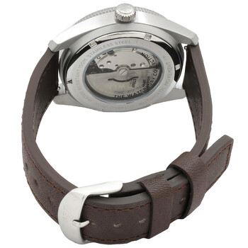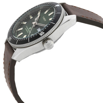 Silver-tone stainless steel case with a brown leather strap. Uni-directional rotating black stainless steel bezel. Green dial with silver-tone hands and index hour markers. Minute markers around the outer rim. Dial Type: Analog. Day of the week and date display at the 3 o'clock position. Automatic movement. Scratch resistant mineral crystal. Transparent case back. Round case shape, case size: 40 mm, case thickness: 13 mm. Band width: 20 mm. Buckle clasp. Water resistant at 100 meters / 330 feet. Functions: date, day, hour, minute, second. Waterbury Series. Sport watch style. Item Variations: TW2V24700V3. Timex Waterbury Automatic Green Dial Men's Watch TW2V24700.