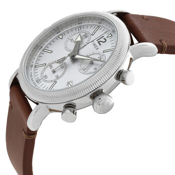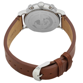 Silver-tone brass case with a brown leather strap. Fixed silver-tone bezel. Silver dial with silver-tone hands and index-Arabic numeral hour markers. Minute markers around the outer rim. Dial Type: Analog. Luminescent hands and markers. Date display at the 4 o'clock position. Chronograph - three sub-dials displaying: 60 second, 30 minute and 24 hours. Quartz movement. Scratch resistant mineral crystal. Pull / push crown. Solid case back. Round case shape, case size: 49 mm, case thickness: 10 mm. Band width: 20 mm. Tang clasp. Water resistant at 30 meters / 100 feet. Functions: chronograph, date, hour, minute, second, stop watch. Waterbury Series. Dress watch style. Item Variations: TW2W20800VQ. Timex Waterbury Chronograph Quartz Silver Dial Men's Watch TW2W20800.