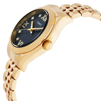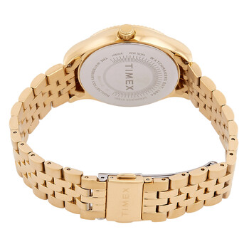 Gold-tone stainless steel case and bracelet. Fixed gold-tone stainless steel bezel. Black dial with gold-tone hands and index-Roman numeral hour markers. Dial Type: Analog. Luminescent hands. Quartz movement. Scratch resistant mineral crystal. Pull / push crown. Solid case back. Round case shape, case size: 34 mm. Band width: 16 mm. Deployment with push button release clasp. Water resistant at 50 meters / 165 feet. Functions: hour, minute, second. Waterbury Legacy Series. Dress watch style. Timex Waterbury Legacy Quartz Black Dial Ladies Watch TW2V45700VQ.