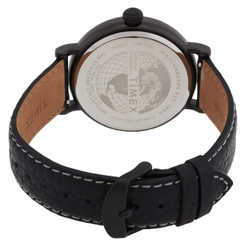 Black stainless steel case with a black leather strap. Fixed black stainless steel bezel. Black dial with black hands and Arabic numeral hour markers. Minute markers around the outer rim. Dial Type: Analog. Quartz movement. Scratch resistant mineral crystal. Pull / push crown. Solid case back. Round case shape, case size: 43 mm. Band length: 8 inches. Tang clasp. Water resistant at 30 meters / 100 feet. Functions: hour, minute, second. Waterbury Series. Casual watch style. Timex Waterbury Quartz Black Dial Men's Watch TW2T91000VQ.