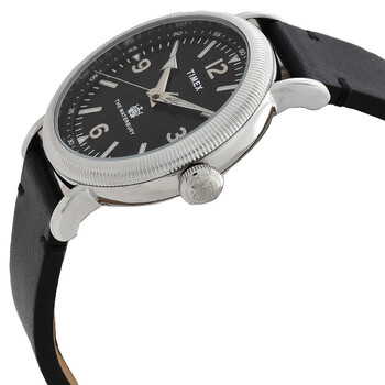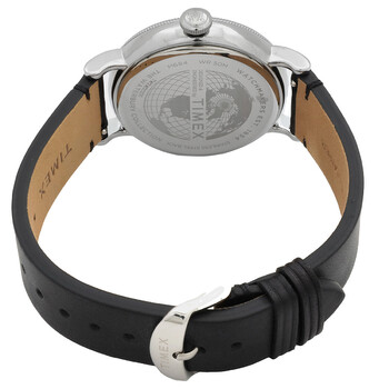 Silver-tone low lead brass case with a black leather strap. Fixed silver-tone low lead brass bezel. Black dial with silver-tone hands and index-Arabic numeral hour markers. Arabic numeral marker appears at the 3, 6, 9 and 12 o'clock positions. Minute markers around the outer rim. Dial Type: Analog. Quartz movement. Scratch resistant mineral crystal. Pull / push crown. Solid case back. Round case shape, case size: 40 mm. Buckle clasp. Water resistant at 50 meters / 165 feet. Functions: hour, minute, second. Waterbury Series. Casual watch style. Item Variations: TW2W20200VQ. Timex Waterbury Standard Quartz Black Dial Men's Watch TW2W20200.