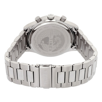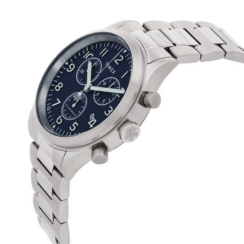 Silver-tone stainless steel case and bracelet. Fixed silver-tone stainless steel bezel. Blue dial with silver-tone hands and Arabic numeral hour markers. Minute markers around the outer rim. Dial Type: Analog. Luminescent hands and markers. Date display at the 4 o'clock position. Chronograph - three sub-dials displaying: 60 second, 30 minute and 1/10th of a second. Quartz movement. Scratch resistant mineral crystal. Solid case back. Round case shape, case size: 42 mm, case thickness: 11.5 mm. Band width: 22 mm. Fold over clasp. Water resistant at 100 meters / 330 feet. Functions: chronograph, date, hour, minute, second. Waterbury Series. Sport watch style. Item Variations: TW2W48200VQ. Timex Waterbury Traditional Chronograph Quartz Blue Dial Men's Watch TW2W48200.