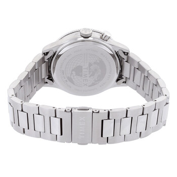 Silver-tone stainless steel case and bracelet. Bi-directional rotating black and red stainless steel bezel. Black dial with silver-tone hands and index hour markers. Minute markers around the outer rim. Dial Type: Analog. Date display at the 3 o'clock position. Quartz movement. Scratch resistant mineral crystal. Solid case back. Round case shape, case size: 39 mm, case thickness: 11.5 mm. Band width: 20 mm. Fold over clasp. Water resistant at 100 meters / 330 feet. Functions: GMT, second time zone, date, hour, minute, second. Waterbury Series. Sport watch style. Item Variations: TW2W22700VQ. Timex Waterbury Traditional GMT Quartz Black Dial Men's Watch TW2W22700.