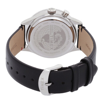 Silver-tone stainless steel case with a black synthetic rubber strap. Bi-directional rotating black and red stainless steel bezel. Black dial with silver-tone hands and index hour markers. Minute markers around the outer rim. Dial Type: Analog. Date display at the 3 o'clock position. Quartz movement. Scratch resistant mineral crystal. Solid case back. Round case shape, case size: 39 mm, case thickness: 11.5 mm. Band width: 20 mm. Buckle clasp. Water resistant at 100 meters / 330 feet. Functions: GMT, second time zone, date, hour, minute, second. Waterbury Series. Sport watch style. Item Variations: TW2W22800VQ. Timex Waterbury Traditional GMT Quartz Black Dial Men's Watch TW2W22800.