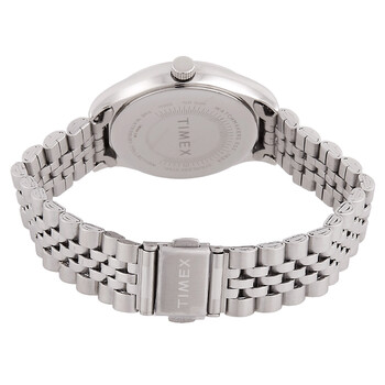 Silver-tone stainless steel case and bracelet. Fixed bezel. White dial with silver-tone hands and index-Arabic numeral hour markers. Minute markers around the outer rim. Arabic numeral at 3,6,9 and 12 o' clock position. Dial Type: Analog. Quartz movement. Scratch resistant mineral crystal. Solid case back. Round case shape, case size: 34 mm, case thickness: 11 mm. Band width: 16 mm. Deployment with push button release clasp. Water resistant at 50 meters / 165 feet. Functions: hour, minute, second. Waterbury Traditional Series. Casual watch style. Timex Waterbury Traditional Quartz White Dial Ladies Watch TW2R69400.