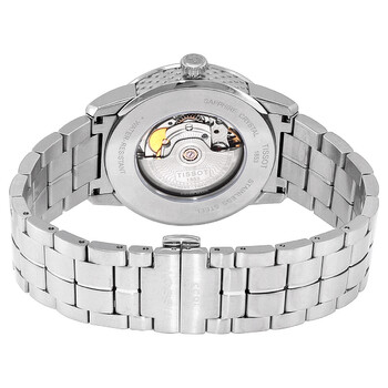 Stainless steel case with a stainless steel bracelet. Fixed stainless steel bezel. Blue dial with silver-tone hands and alternating index and Arabic numeral hour markers. Minute markers around the outer rim. Dial Type: Analog. Date display at the 3 o'clock position. Powermatic 80.111 automatic movement, containing 23 Jewels, bitting at 28800 vph, and has a power reserve of approximately 80 hours. Scratch resistant sapphire crystal. Pull / push crown. Transparent case back. Round case shape. Case size: 41 mm. Case thickness: 9.8 mm. Band width: 22 mm. Butterfly clasp with a push button release. Water resistant at 50 meters / 165 feet. Functions: date, hour, minute, second. Casual watch style. Watch label: Swiss Made. Tissot Automatic Blue Dial Men's Watch T086.407.11.047.00.