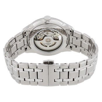 Silver-tone stainless steel case and bracelet. Fixed silver-tone stainless steel bezel. Slate dial with silver-tone hands and index hour markers. Minute scale around the inner rim. Dial Type: Analog. Date display at the 6 o'clock position. Automatic movement with an 80-hour power reserve. Scratch resistant sapphire crystal. Screw down crown. Transparent see through case back. Round case shape, case size: 39 mm. Fold over clasp with a safety release. Water resistant at 50 meters / 165 feet. Functions: date, hour, minute, second. Dress watch style. Watch label: Swiss Made. Tissot Automatic Men's Watch T1398361104800.