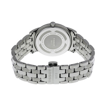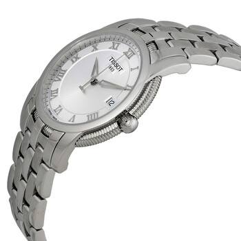 Stainless steel case with a stainless steel bracelet. Fixed bezel. Silver dial with silver-toned hands and Roman numeral hour markers. Minute markers around the outer rim. Date display at the 3 o'clock position. Quartz movement. Scratch resistant sapphire crystal. Case diameter: 39mm. Case thickness: 7mm. Deployment clasp. Water resistant at 30 meters / 100 feet. Functions: date, hour, minute, second. Watch label: Swiss Made. Tissot Ballade III Men's Watch T0314101103300.