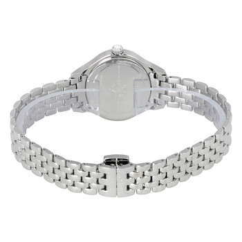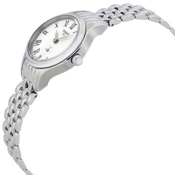 Stainless steel case with a stainless steel bracelet. Fixed stainless steel bezel. White dial with silver-tone hands and Roman numeral hour markers. Minute markers around the outer rim. Dial Type: Analog. Seconds sub-dial above the 6 o'clock position. Quartz movement. Scratch resistant sapphire crystal. Pull / push crown. Solid case back. Case size: 27 mm. Case thickness: 7.73 mm. Oval case shape. Band width: 12 mm. Deployment clasp with a push button. Water resistant at 30 meters / 100 feet. Functions: hour, minute, second. Casual watch style. Tissot Bella Ora Piccola Ladies Watch T1031101103300.