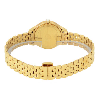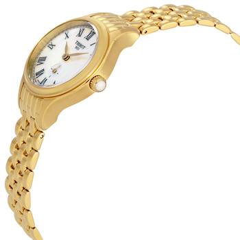 Yellow gold PVD stainless steel case and bracelet. Fixed yellow gold PVD stainless steel bezel. Mother of pearl dial with yellow gold-tone hands and Roman numeral hour markers. Minute markers around the outer rim. Dial Type: Analog. One subdial displaying: small second. ETA Caliber 980.153 quartz movement. Scratch resistant sapphire crystal. Pull / push crown. Solid case back. Oval case shape, case size: 24mm x 27mm, case thickness: 7.3 mm. Band width: 12 mm. Butterfly clasp. Water resistant at 30 meters / 100 feet. Functions: hour, minute, small second. Bella Ora Series. Dress watch style. Watch label: Swiss Made. Tissot Bella Ora Piccola Ladies Watch T1031103311300.