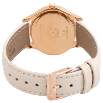 Rose gold PVD stainless steel case with a cream leather strap. Fixed rose gold PVD bezel. White dial with rose gold-tone hands and Roman numeral hour markers. Dial Type: Analog. Small second sub-dial. ETA caliber 980.153 quartz movement. Scratch resistant sapphire crystal. Pull / push crown. Solid case back. Oval case shape. Case size: 31.4 mm. Case thickness: 6.6 mm. Band width: 16 mm. Tang clasp. Water resistant at 30 meters / 100 feet. Functions: hour, minute, small second, battery eol indicator. Bella Ora Series. Casual watch style. Watch label: Swiss Made. Tissot Bella Ora Quartz White Dial Ladies Watch T103.310.36.013.00.