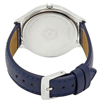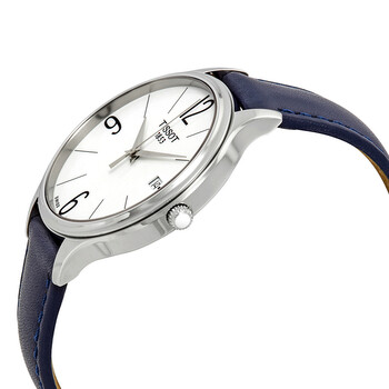 Stainless steel case with a blue (croco-embossed) leather strap. Fixed stainless steel bezel. White dial with silver-tone dauphine-style shape hands and index hour markers. Arabic numerals mark the 6, 9 and 12 o'clock positions. Dial Type: Analog. Date display at the 3 o'clock position. ETA caliber F06.111 quartz movement. Scratch resistant sapphire crystal. Pull / push crown. Solid case back. Round case shape. Case size: 38 mm. Case thickness: 7.1 mm. Band width: 16 mm. Tang clasp. Water resistant at 30 meters / 100 feet. Functions: date, hour, minute, second. Additional Info: comes with an additional strap. Bella Ora Series. Casual watch style. Watch label: Swiss Made. Tissot Bella Ora White Dial Ladies Watch T103.210.16.017.00.