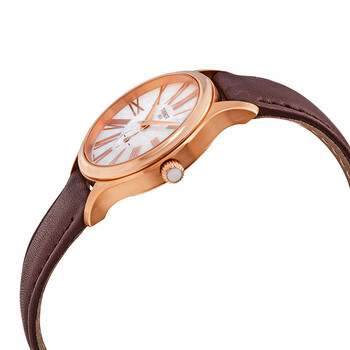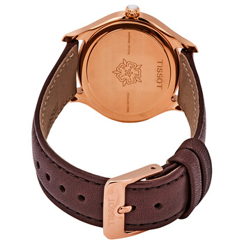Rose gold PVD stainless steel case with a brown leather strap. Fixed rose gold PVD bezel. White mother of pearl dial with rose gold-tone dauphine-style shape hands and Roman numeral hour markers. Dial Type: Analog. One subdial displaying: small second. ETA Caliber 980.153 quartz movement. Scratch resistant sapphire crystal. Pull / push crown. Solid case back. Oval case shape, case size: 28 mm x 31.4 mm, case thickness: 6.6 mm. Band width: 16 mm. Tang clasp. Water resistant at 30 meters / 100 feet. Functions: hour, minute, second. Bella Ora Series. Casual watch style. Watch label: Swiss Made. Item Variations: T1033103611300. Tissot Bella Ora White Mother of Pearl Dial Ladies Watch T1033103611300.