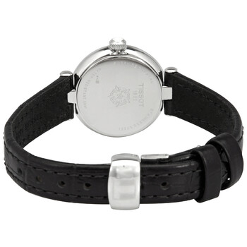 Stainless steel case with a black (cow) leather strap. Fixed stainless steel bezel. White dial with black hands and Roman numeral hour markers. Minute markers around the outer rim. Dial Type: Analog. Date display at the o'clock position. ETA caliber F03.111 quartz movement. Scratch resistant sapphire crystal. Pull / push crown. Solid case back. Round case shape. Case size: 26 mm. Case thickness: 6.9 mm. Band width: 4 mm. Butterfly clasp. Water resistant at 50 meters / 165 feet. Functions: date, hour, minute, second, battery eol indicator. Bellissima Small Series. Casual watch style. Watch label: Swiss Made. Tissot Bellissima Small Quartz White Dial Ladies Watch T126.010.16.013.00.