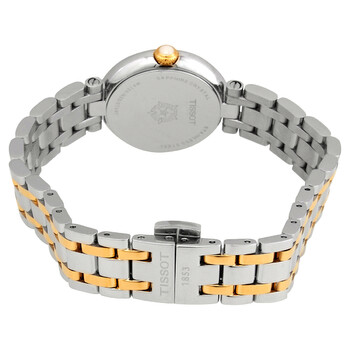 Stainless steel case with a two-tone (silver-tone and yellow gold PVD) stainless steel bracelet. Fixed stainless steel bezel with a yellow gold PVD ring. White dial with gold-tone hands and Roman numeral hour markers. Minute markers around the outer rim. Dial Type: Analog. Date display at the 6 o'clock position. ETA caliber F03.111 quartz movement. Scratch resistant sapphire crystal. Pull / push crown. Solid case back. Round case shape. Case size: 26 mm. Case thickness: 6.9 mm. Band width: 4 mm. Fold over clasp with a push button release. Water resistant at 50 meters / 165 feet. Functions: date, hour, minute, second, battery eol indicator. Bellissima Small Series. Casual watch style. Watch label: Swiss Made. Tissot Bellissima Small Quartz White Dial Ladies Watch T126.010.22.013.00.
