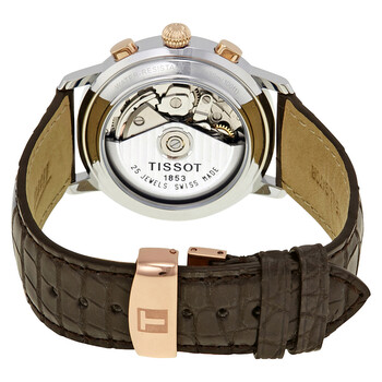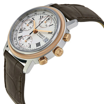 Stainless steel case with a brown leather strap. Fixed 18kt rose gold bezel. Silver dial with rose gold-tone hands and Roman numeral hour markers. Minute markers. tachymeter markings around the outer rim. Dial Type: Analog. Date display at the 3 o'clock position. Chronograph - three sub-dials displaying: 60 second, 30 minute and 12 hours. ETA 7750 automatic movement. Scratch resistant sapphire crystal. Transparent case back. Case size: 37.7 mm. Case thickness: 12.62 mm. Round case shape. Band width: 20 mm. Butterfly clasp. Water resistant at 30 meters / 100 feet. Functions: chronograph, tachymeter, date, hour, minute, second. Additional Info: limited edition of 500 pieces. Dress watch style. Watch label: Swiss Made. Tissot Bridgeport Automatic Chronograph Men's Watch T71.1.467.13.