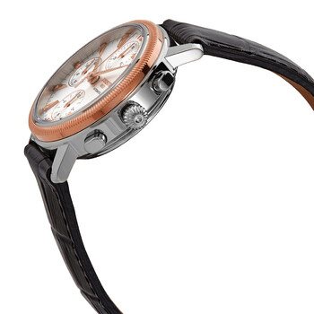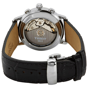 Stainless steel case with a black leather strap. Fixed stainless steel bezel with an inlaid 18kt rose gold ring. Silver dial with rose gold-tone hands and diamond-tipped index hour markers. Minute markers around the outer rim. Dial Type: Analog. Date display at the 3 o'clock position. Chronograph - three sub-dials displaying: 60 second, 30 minute and 12 hour. VALJOUX A05.H21 automatic movement, based upon ETA 7750, containing 25 Jewels, bitting at 28800 vph, and has a power reserve of approximately 60 hours. Scratch resistant sapphire crystal. Transparent case back. Round case shape. Case size: 37.7 mm. Case thickness: 12.62 mm. Band width: 20 mm. Butterfly clasp. Water resistant at 30 meters / 100 feet. Functions: chronograph, date, hour, minute, second. Bridgeport Series. Casual watch style. Watch label: Swiss Made. Tissot Bridgeport Chronograph Automatic Diamond Silver Dial Men's Watch T921.427.46.036.00.