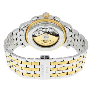 Stainless steel case with a two-tone (silver-tone and yellow gold PVD) stainless steel bracelet. Fixed two-tone (silver-tone and yellow gold PVD) bezel. Silver dial with yellow gold-tone hands and Roman numeral hour markers. Minute markers around the outer rim. Dial Type: Analog. Date display at the 6 o'clock position. Chronograph - three sub-dials displaying: 60 second, 30 minute and 12 hours. ETA-Valjoux caliber 7753 automatic movement, based upon ETA 7750, containing 27 Jewels, bitting at 28800 vph, and has a power reserve of approximately 44 hours. Scratch resistant sapphire crystal. Transparent case back. Round case shape. Case size: 42 mm. Case thickness: 13.19 mm. Band width: 20 mm. Butterfly clasp. Water resistant at 50 meters / 165 feet. Functions: chronograph, date, hour, minute, second. Additional Info: in general, suitable for short periods of recreational swimming, but not diving or snorkeling. Luxury watch style. Watch label: Swiss Made. Tissot Bridgeport Chronograph Automatic Men's Watch T097.427.22.033.00.