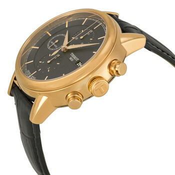 Rose gold-plated stainless steel case with a black leather strap. Fixed rose gold-plated bezel. Black dial with rose gold-tone hands and index hour markers. Minute markers around the outer rim. Dial Type: Analog. Date display at the 3 o'clock position. Chronograph - three sub-dials displaying: 60 second, 30 minute and 1/10th of a second. Automatic movement with a 45-hour power reserve. Scratch resistant sapphire crystal. Case diameter: 42.3 mm. Case thickness: 13.78 mm. Round case shape. Deployment clasp. Water resistant at 30 meters / 100 feet. Functions: chronograph, date, hour, minute, second. Dress watch style. Tissot Carson Automatic Chronograph Black Dial Black Leather Men's Watch T0854273606100.