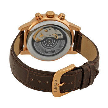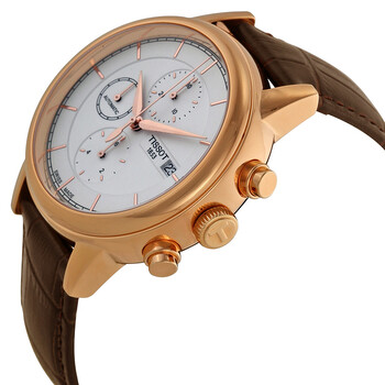 Rose gold PVD stainless steel case with a brown leather strap. Fixed rose gold PVD bezel. Silver dial with rose gold-tone hands and index hour markers. Minute markers around the outer rim. Dial Type: Analog. Date display at the 3 o'clock position. Chronograph - three sub-dials displaying: 60 second, 30 minute and 6 hour. ETA caliber C01.211 automatic movement with a 45-hour power reserve. Scratch resistant sapphire crystal. Pull / push crown. Skeleton case back. Case size: 42 mm. Case thickness: 13 mm. Round case shape. Band width: 20 mm. Band length: 8 inches. Tang clasp. Water resistant at 30 meters / 100 feet. Functions: chronograph, date, hour, minute, second. Casual watch style. Watch label: Swiss Made. Item Variations: T0854273601100. Tissot Carson Automatic Chronograph Silver Dial Men's Watch T085.427.36.011.00.
