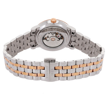 Silver-tone stainless steel case with a two-tone (silver-tone and rose gold PVD) stainless steel bracelet. Fixed rose gold PVD stainless steel bezel. Silver dial with black hands and Roman numeral hour markers. Dial Type: Analog. Date display at the 6 o'clock position. ETA Caliber 2671 Automatic movement, containing 25 Jewels, bitting at 28800 vph, and has a power reserve of approximately 38 hours. Scratch resistant sapphire crystal. Pull / push crown. Transparent see through case back. Round case shape, case size: 30 mm, case thickness: 9.5 mm. Band width: 15 mm. Deployment with push button release clasp. Water resistant at 50 meters / 165 feet. Functions: date, hour, minute, second. Carson Series. Casual watch style. Watch label: Swiss Made. Tissot Carson Automatic Silver Dial Two-tone Ladies Watch T122.207.22.033.00.
