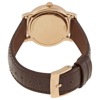Rose gold PVD stainless steel case with a brown leather strap. Fixed rose gold PVD stainless steel bezel. Silver dial with black hands and Roman numeral hour markers. Dial Type: Analog. Date display above the 6 o'clock position. ETA Caliber F03.115 quartz movement. Scratch resistant sapphire crystal. Pull / push crown. Solid case back. Round case shape. Case size: 30 mm. Case thickness: 6.7 mm. Band width: 15 mm. Tang clasp. Water resistant at 50 meters / 165 feet. Functions: date, hour, minute, second. Casual watch style. Watch label: Swiss Made. Tissot Carson Premium Lady Quartz Silver Dial Ladies Watch T122.210.36.033.00.