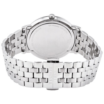 Stainless steel case with a stainless steel bracelet. Fixed stainless steel bezel. Silver dial with blue leaf-style hands and black Roman numeral hour markers. Dial Type: Analog. Date display at the 6 o'clock position. ETA caliber F06.115 quartz movement. Scratch resistant sapphire crystal. Pull / push crown. Solid case back. Round case shape. Case size: 40 mm. Case thickness: 6.97 mm. Band width: 20 mm. Fold over clasp with a double push button release. Water resistant at 50 meters / 165 feet. Functions: date, hour, minute, second. Casual watch style. Watch label: Swiss Made. Tissot Carson Premium Quartz Silver Dial Men's Watch T122.410.11.033.00.