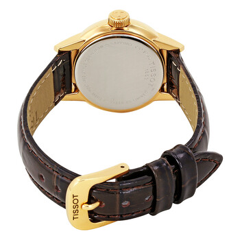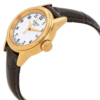 Rose gold PVD stainless steel case with a brown leather strap. Fixed rose gold PVD bezel. White dial with rose gold-tone hands and Arabic numeral hour markers. Minute markers around the outer rim. Dial Type: Analog. Date display at the 3 o'clock position. ETA 803.112 quartz movement. Scratch resistant sapphire crystal. Solid case back. Case size: 29.5 mm. Case thickness: 8.2 mm Round case shape. Strap width: 14 mm. Butterfly clasp. Water resistant at 30 meters / 100 feet. Functions: date, hour, minute, second. Casual watch style. Watch label: Swiss Made. Tissot Carson White Dial Brown Leather Ladies Watch T0852103601200.