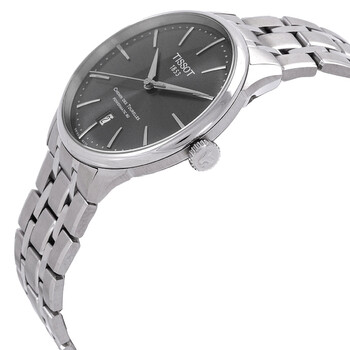 Silver-tone stainless steel case and bracelet. Fixed silver-tone stainless steel bezel. Grey dial with silver-tone hands and index hour markers. Minute markers around the outer rim. Dial Type: Analog. Date display at the 6 o'clock position. Powermatic 80.111 Automatic movement, containing 23 Jewels, bitting at 28800 vph, and has a power reserve of approximately 80 hours. Scratch resistant sapphire crystal. Pull / push crown. Transparent case back. Round case shape, case size: 39 mm, case thickness: 11.2 mm. Band width: 20 mm. Butterfly clasp. Water resistant at 50 meters / 165 feet. Functions: date, hour, minute, second. Chemin Des Tourelles Series. Casual watch style. Watch label: Swiss Made. Tissot Chemin Des Tourelles Automatic Grey Dial Men's Watch T139.807.11.061.00.
