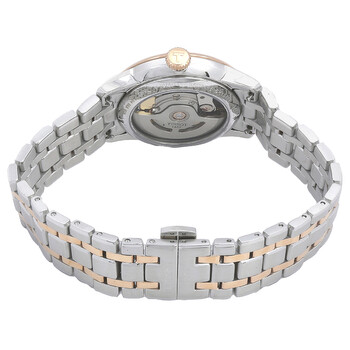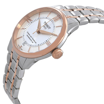 Silver-tone stainless steel case with a two-tone (silver-tone and rose gold PVD) stainless steel bracelet. Fixed rose gold PVD stainless steel bezel. Silver dial with rose gold-tone hands and index-Roman numeral hour markers. Roman numeral marker appears at the 3, 6, 9 and 12 o'clock positions. Minute markers around the outer rim. Dial Type: Analog. Date display at the 6 o'clock position. Powermatic 80.111 Automatic movement, containing 23 Jewels, bitting at 28800 vph, and has a power reserve of approximately 80 hours. Scratch resistant sapphire crystal. Pull / push crown. Transparent case back. Round case shape, case size: 34 mm, case thickness: 10.5 mm. Band width: 18 mm. Butterfly clasp. Water resistant at 50 meters / 165 feet. Functions: date, hour, minute, second. Chemin Des Tourelles Series. Casual watch style. Watch label: Swiss Made. Tissot Chemin Des Tourelles Automatic Silver Dial Two-Tone Ladies Watch T1392072203800.