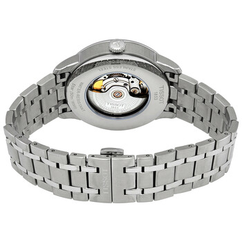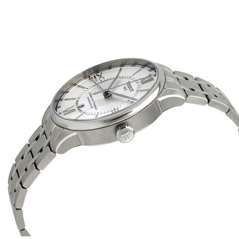 Stainless steel case with a stainless steel bracelet. Fixed stainless steel bezel. Silver dial with silver-tone alpha-style hands and index hour markers. Roman numerals appear at the 3, 6, 9 and 12 o'clock positions. Minute markers around an inner ring. 24 hour (GMT) markers. Dial Type: Analog. Date display at the 6 o'clock position. Powermatic 80.661 automatic movement, containing 25 Jewels, bitting at 28800 vph, and has a power reserve of approximately 80 hours. Scratch resistant sapphire crystal. Pull / push crown. Transparent case back. Round case shape. Case size: 42 mm. Case thickness: 12.5 mm. Band width: 21 mm. Fold over clasp with a push button release. Water resistant at 50 meters / 165 feet. Functions: GMT, second time zone, hour, minute, second, date. Casual watch style. Watch label: Swiss Made. Tissot Chemin des Tourelles GMT Automatic MensWatch T099.429.11.038.00.