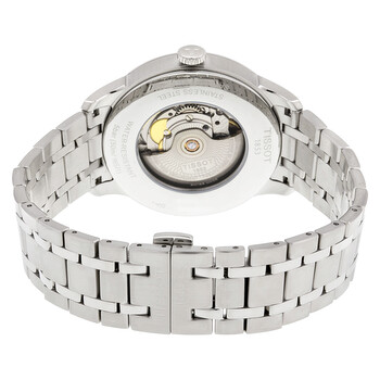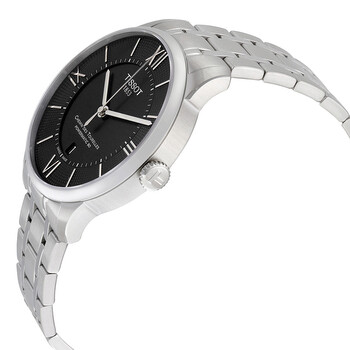 Stainless steel case with a stainless steel bracelet. Fixed stainless steel bezel. Black dial with silver-tone arrow-shaped hands and index hour markers. Roman numerals mark the 3, 6, 9 and 12 o'clock positions. Minute markers around an inner ring. Dial Type: Analog. Date display at the 6 o'clock position. Tissot calibre Powermatic 80 (C07.111) automatic movement, based upon ETA 2824-2, containing 23 Jewels, bitting at 21600 vph, and has a power reserve of approximately 80 hours. Scratch resistant synthetic sapphire crystal. Pull / push crown. Solid case back. Round case shape. Case size: 42 mm. Case thickness: 11 mm. Band width: 21 mm. Hidden fold over clasp. Water resistant at 50 meters / 165 feet. Functions: date, hour, minute, second. Casual watch style. Watch label: Swiss Made. Tissot Chemin Des Tourelles Powermatic 80 Men's Watch T0994071105800.