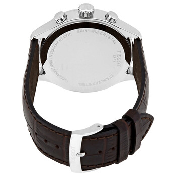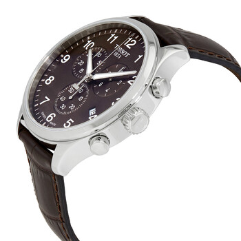Stainless steel case with a brown (croco-embossed) leather strap. Fixed stainless steel bezel. Brown dial with luminous silver-tone hands and Arabic numeral hour markers. Minute markers around the outer rim. Dial Type: Analog. Luminescent hands and markers. Date display at the 4 o'clock position. Chronograph - three sub-dials displaying: 60 second, 30 minute and 1/10th of a second. ETA caliber G10.212 quartz movement. Scratch resistant sapphire crystal. Screw down crown. Solid case back. Round case shape. Case size: 45 mm. Case thickness: 11.02 mm. Band width: 22 mm. Tang clasp. Water resistant at 100 meters / 330 feet. Functions: chronograph, rattrapante, date, hour, minute, small second. Additional Info: suitable for short periods of recreational swimming and showering, but not diving or snorkeling. Sport watch style. Watch label: Swiss Made. Tissot Chrono XL Chronograph Quartz Brown Dial Men's Watch T116.617.16.297.00.