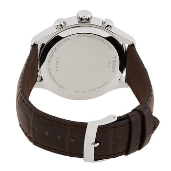 Silver-tone stainless steel case with a brown leather strap. Fixed silver-tone stainless steel bezel. Green dial with silver-tone hands and Arabic numeral hour markers. Minute markers around the outer rim. Dial Type: Analog. Luminescent hands and markers. Date display at the 4 o'clock position. Chronograph - three sub-dials displaying: 60 second, 30 minute and 1/10th of a second. Quartz movement. Scratch resistant sapphire crystal. Pull / push crown. Solid case back. Round case shape, case size: 45 mm, case thickness: 11 mm. Band width: 22 mm. Water resistant at 100 meters / 330 feet. Functions: chronograph, date, hour, minute, second. Chrono Xl Classic Series. Watch label: Swiss Made. Tissot Chrono XL Classic Quartz Green Dial Men's Watch T1166171609200.