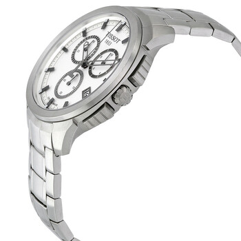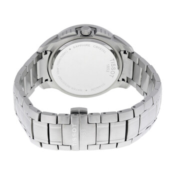 Titanium case with a titanium bracelet. Fixed titanium bezel. Silver dial with luminous skeleton hands and index hour markers. Minute markers around the outer rim. Dial Type: Analog. Date display at the 4 o'clock position. Chronograph - three sub-dials displaying: 60 second, 60 minute and 12 hour. Quartz movement. Scratch resistant sapphire crystal. Pull / push crown. Solid case back. Case diameter: 43 mm. Case thickness: 11 mm. Round case shape. Band width: 22 mm. Deployment clasp with a push button release. Water resistant at 100 meters / 330 feet. Functions: date, hour, minute, second. Casual watch style. Watch label: Swiss Made. Tissot Chronograph Silver Dial Titanium Men's Watch T0694174403100.