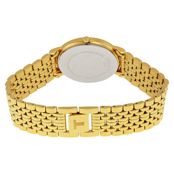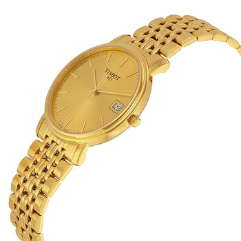 Gold-tone stainless steel case and bracelet. Fixed gold-tone bezel. Champagne dial with gold-tone hands and index hour markers. Minute markers around the outer rim. Dial Type: Analog. Date display at the 3 o'clock position. Quartz movement. Scratch resistant sapphire crystal. Pull / push crown. Solid case back. Case diameter: 34 mm. Case thickness: 7 mm. Round case shape. Band width: 18 mm. Fold over clasp with safety release. Water resistant at 30 meters / 100 feet. Functions: date, hour, minute, second. Casual watch style. Watch label: Swiss Made. Tissot Classic Desire Champagne Dial Gold-tone Ladies Watch T52548121.