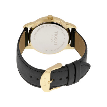Gold PVD stainless steel case with a black leather strap. Fixed gold PVD bezel. Black dial with gold-tone skeleton arrow-shaped hands and index hour markers. Minute markers around the outer rim. Dial Type: Analog. Luminescent hands and markers. Date display at the 3 o'clock position. ETA Caliber 805.112 quartz movement. Scratch resistant sapphire crystal. Pull / push crown. Solid case back. Round case shape. Case size: 38 mm. Case thickness: 7.4 mm. Band width: 22 mm, band length: 8 inches. Tang clasp. Water resistant at 30 meters / 100 feet. Functions: date, hour, minute, second. Classic Dream Series. Casual watch style. Watch label: Swiss Made. Tissot Classic Dream Black Dial Black Leather Men's T0334103605101.